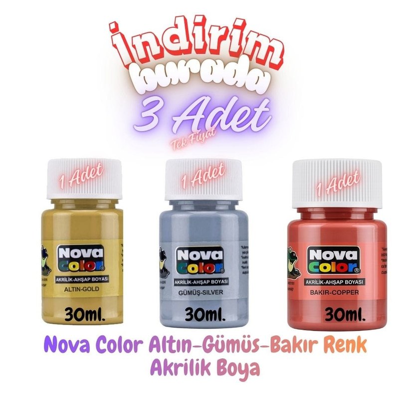 Nova Color Altın – Gümüş – Bakır akrilik boya seti ile projelerine ışıltı kat! Her biri 30 ml, indirime özel 3 adet tek fiyat avantajıyla. Ahşap, tuval ve dekoratif yüzeylerde yüksek kapatıcılık, canlı metalik renkler ve kolay uygulama sunar. Hobi, dekorasyon ve sanatsal çalışmalar için ideal! Stoklarla sınırlı, kaçırma