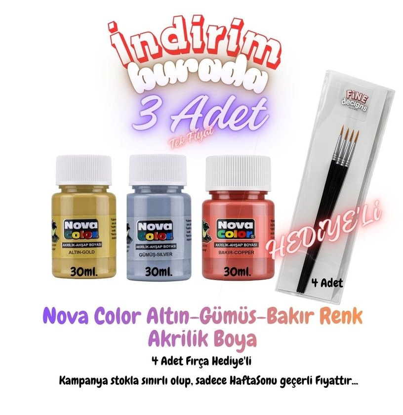 Aldım Fiyatı 'dır... Nova Color'dan 30ml'lik altın, gümüş ve bakır tonlarında 3'lü akrilik boya seti. 4 adet fırça hediye. Kampanya hafta sonu geçerlidir. Nova Color 30ml 3'lü Altın-Gümüş-Bakır Akrilik Boya Hediye'li