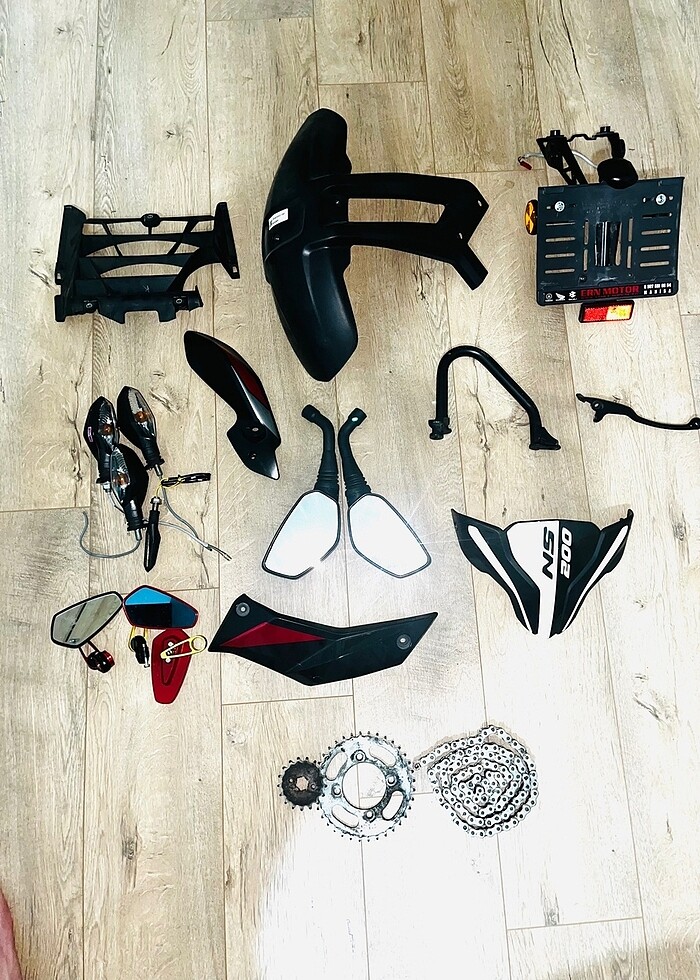 arka sinyal bağlantı demiri saçlı plakalımlı hazır - 750 Tl ön fren maneti - 150 Tl arka çamurluk komle demir ile birlikte - 1400 TL 3 tane sinyal yanına farklı 1 adet kayar sinyal - 500 tl rüzgar sperlik stickerli - 450 Tl radyatör ızgarası - 150 Tl panel far sağ kapak - 400 Tl tek sakal sol - 1000 Tl koruma demiri - 300 Tl ns 200 ug orj ayna 1250 Tl gidon aynaları biri kayıp bi kaç parça eksik - 500 Tl cg için ybr için vb motorlar için dişli seti zincirle beraber bakla olarak kullanılabilir 36T 17T - 500 tl toplu satış vardır toplam fiyat - 7350 tek tek satılır iyi satışlar