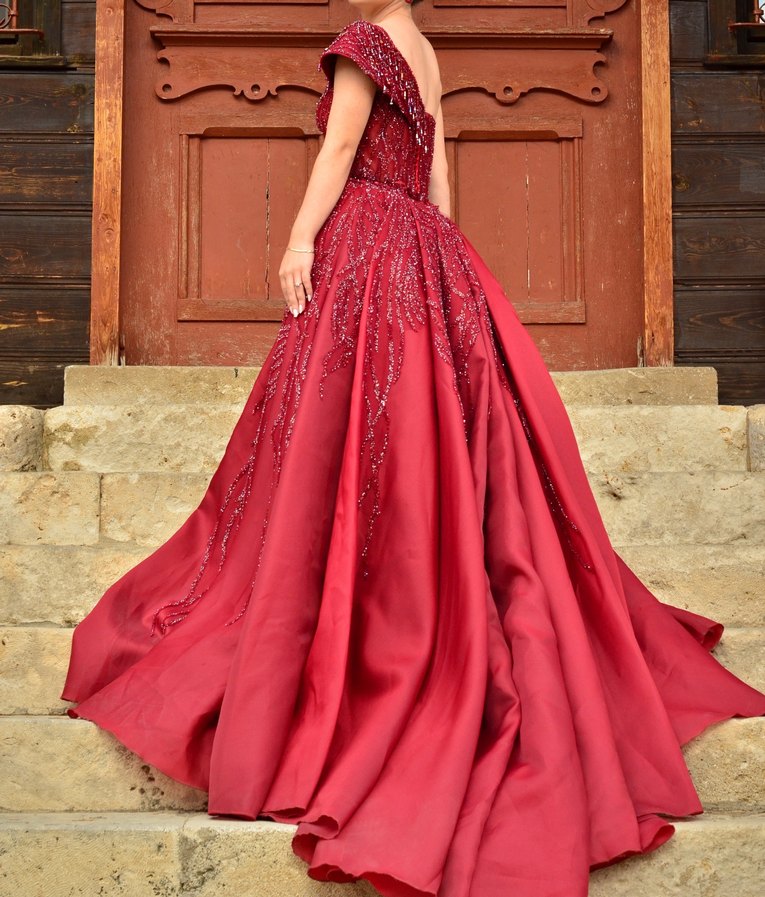 Ns Sposa özel dikim kına elbisesi. Bordo renkli, drapeli ve V yakalı, kolsuz uzun abiye elbise. Kuyruğu takıp çıkarılabilir. İsterseniz kuyruksuz halinin fotoğrafını da paylaşırım. 36 bedene uygundur. Arkası iplidir.