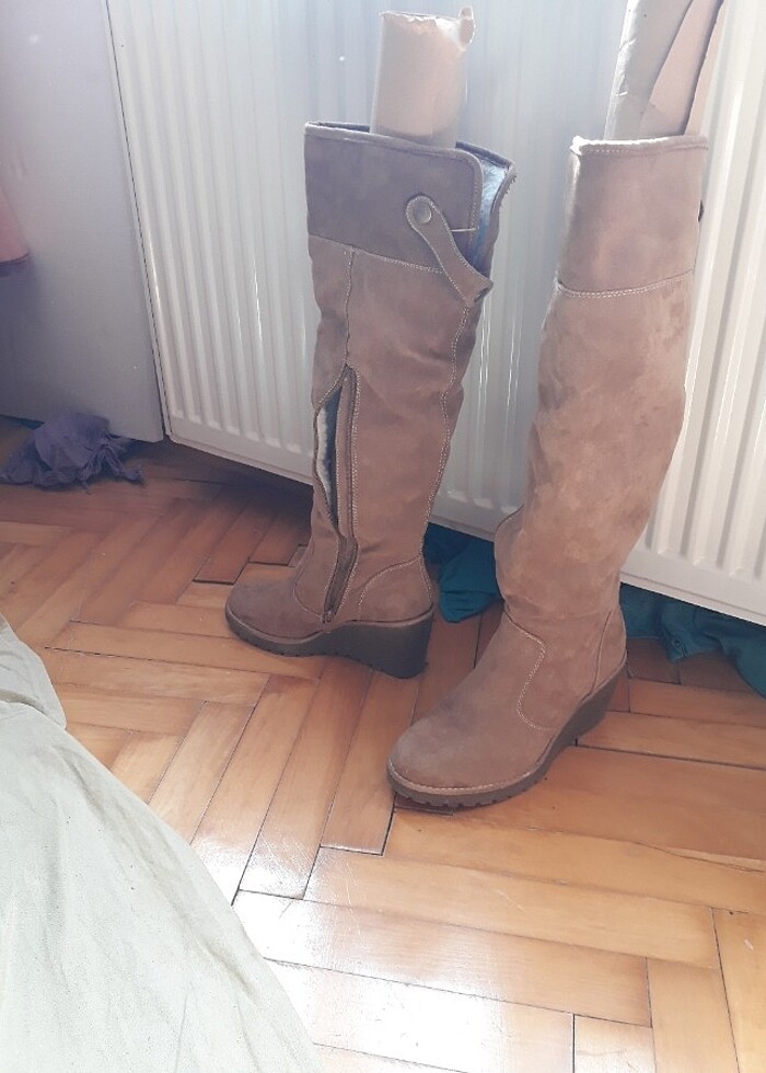 Bir defa kullanıldı arka bantları çıt çıtlı.çıkıp takılabilıyor.bantlarin iç kısmı resimdeki gibi deforme olmuş kutusunda.gorunur yerde degil.ici pamuklu yumuşak rahat bir çizme.Resimdeki gibidir.kullanıma bağlı bir eskime yıpranma yoktur.üstten kıvırarakta kullanılabilen bir çizme bantları çıkarıp kullanılıyor. Topuk boyu 7 cm dır.cizme uzunluk topuğuyla birlikte 48 cm dır dizi kapatıyor.
