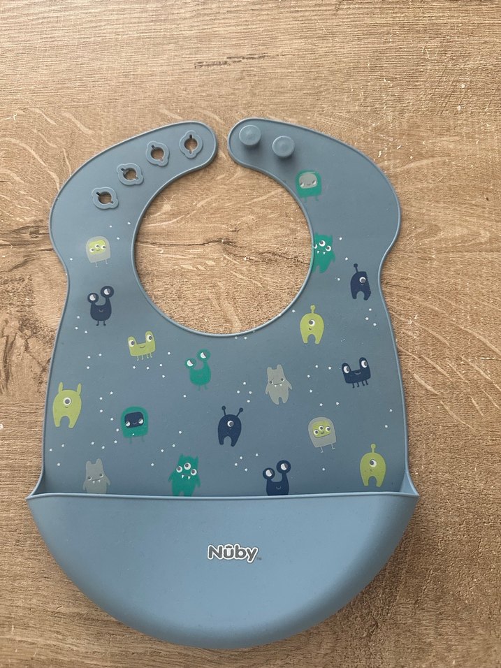 Nuby marka İngiltere’den gelmiştir. Canlı renkli, uzaylı baskılı, silikon mana önlüğü. Boyun kısmı ayarlanabilirdir. Cebi de vardır. Hiçbir hasarı yoktur.