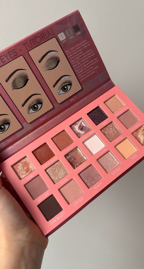 NUDE göz farı paleti, doğal bir görünüm için açık bej tonları içerir. Sıcak allık renkleri ile çeşitli makyaj seçenekleri sunar.