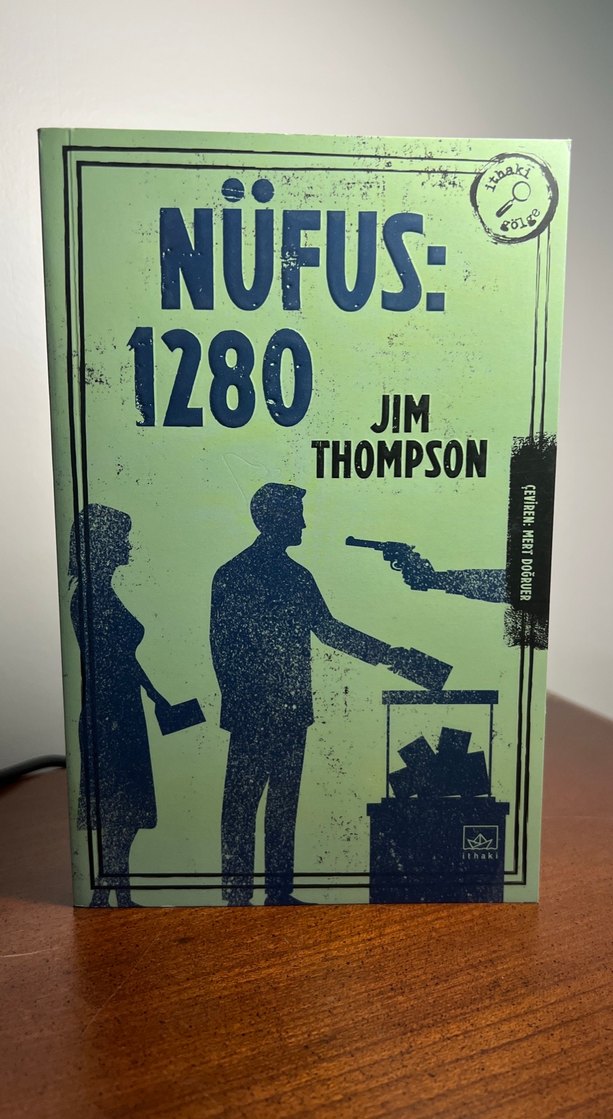 Jim Thompson'ın "Nüfus: 1280" adlı mizah kitabı, kapağında bir adamın belge teslim ettiği ve silah doğrultulduğu gerilimli bir sahne ile birlikte, yanında kitap tutan bir kadın figürü içeriyor.