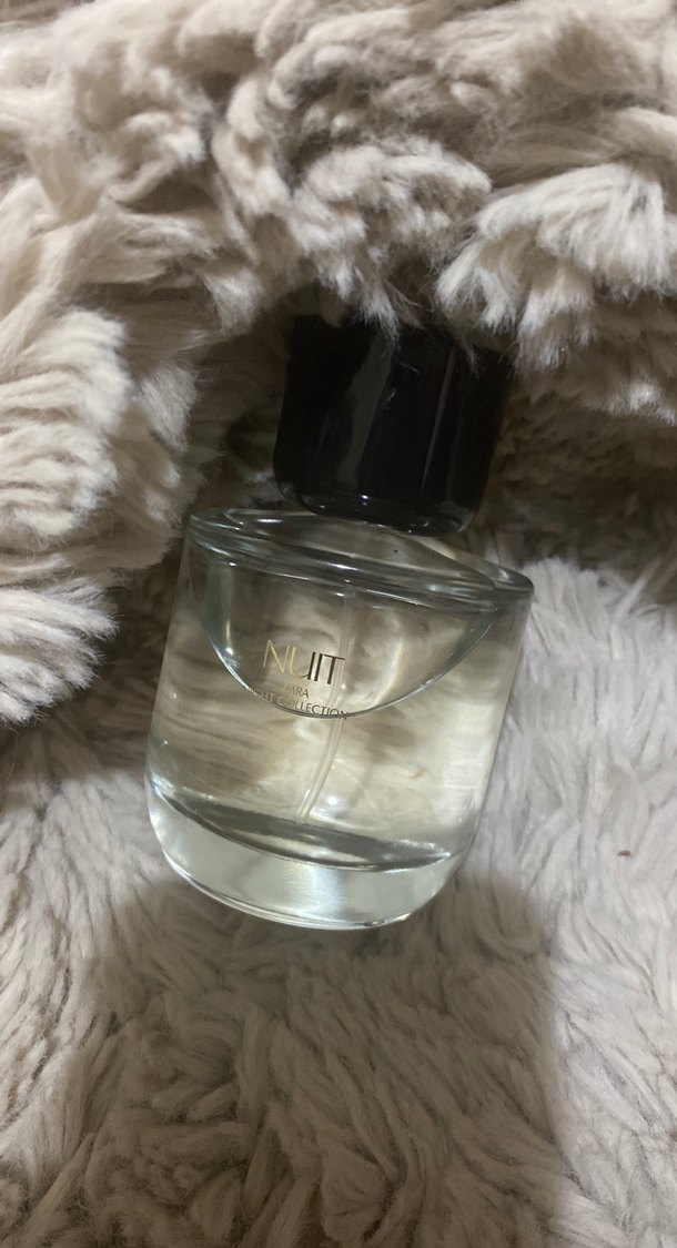 Siyah kapaklı, şeffaf cam şişede Nuit kadın parfümü. Yumuşak dokulu kumaş üzerinde sade tasarım.