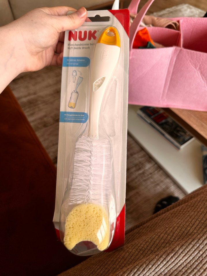 NUK bebek biberon temizleme fırçası, uzun sapı, yumuşak kılları ve sünger ucu ile detaylı temizlik sağlar. Beyaz ve sarı renklidir.