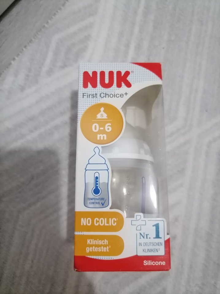 NUK First Choice+ bebek biberonu, 0-6 ay arası için silikon emzikli. Kolik önleyici ve sıcaklık kontrol özellikleri ile klinik olarak test edilmiştir. Beyaz renkte.
