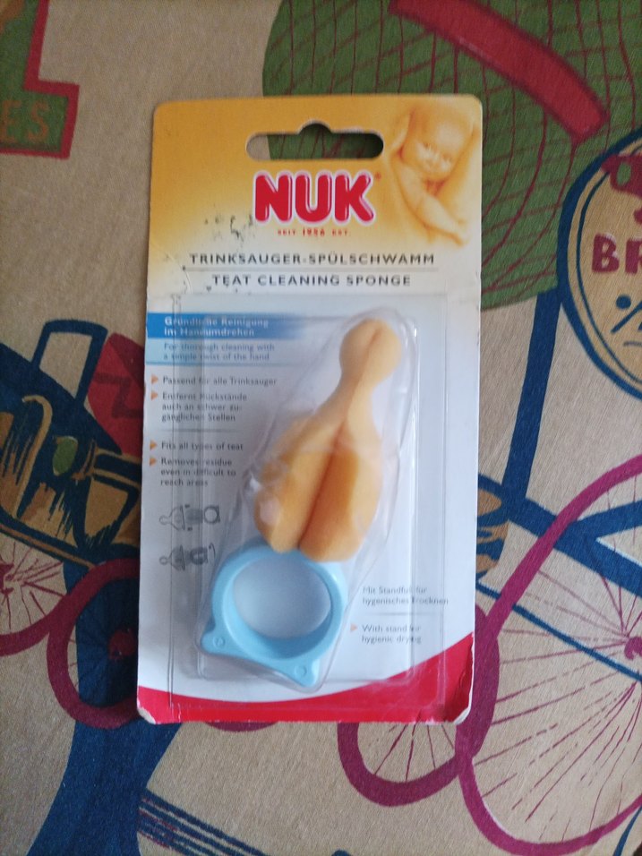 NUK emzik, biberon, temizliğini kolaylaştıran sünger aparatıyla birlikte gelir.