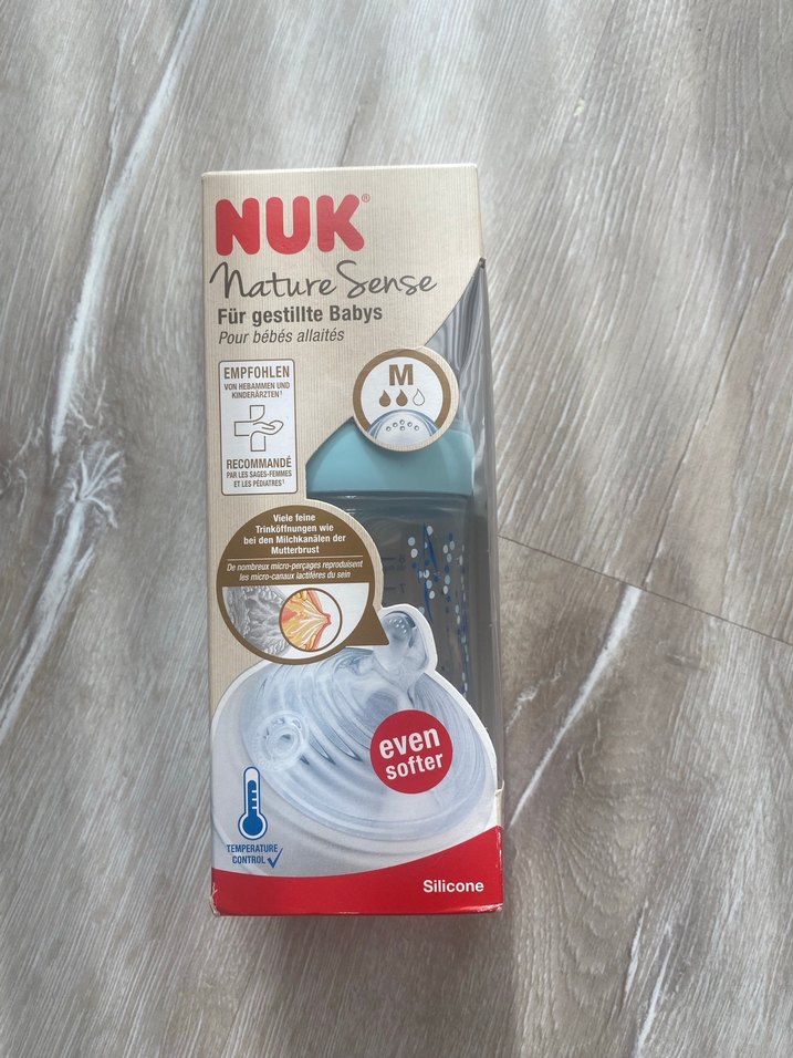NUK Nature Sense mavi renkli bebek biberonu, daha yumuşak silikon emzik ve ısı kontrolü özelliği ile emzirilen bebekler için önerilir.
