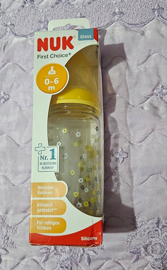 NUK cam biberon, 0-6 ay bebekler için. Hafif sarı kapaklı, silikon emzikli, kolik azaltıcı ve klinik olarak test edilmiş. Küçük çiçek desenleriyle süslenmiştir. ürun almanyadan geldi hiç kullanilmadi