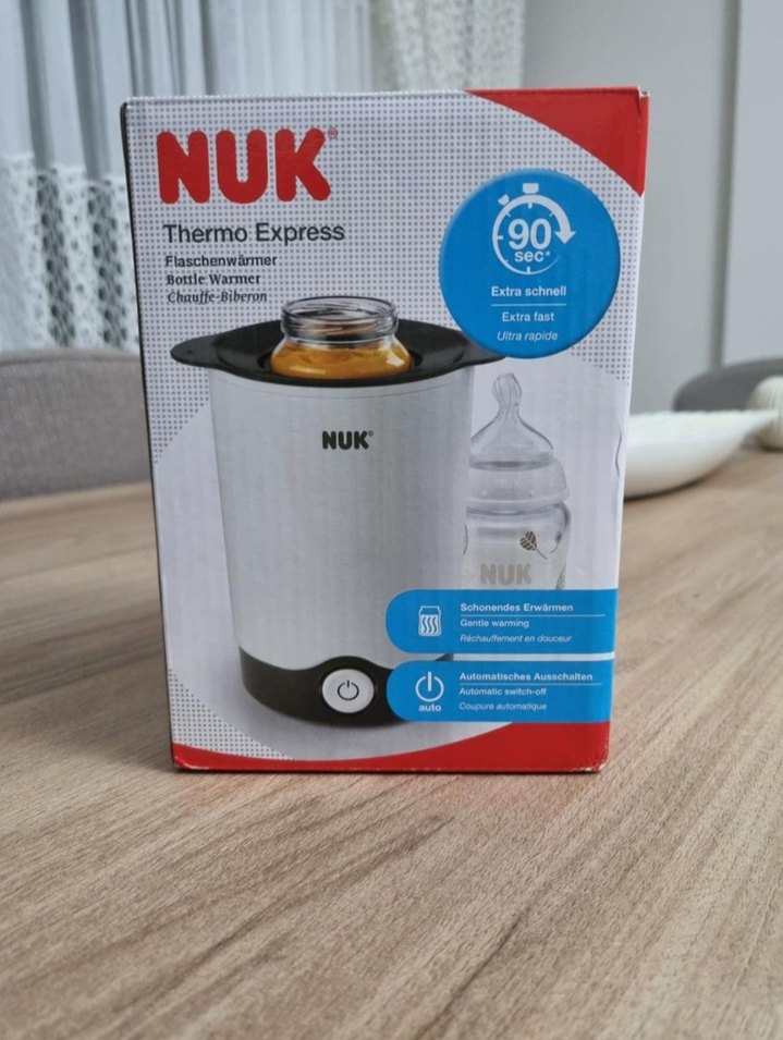 NUK Thermo Express, beyaz ve gri renklerde, bebek şişelerini hızlı ve nazikçe ısıtan bir şişe ısıtıcısıdır. Otomatik kapanma özelliği ve 90 saniyede ısıtma yapar.