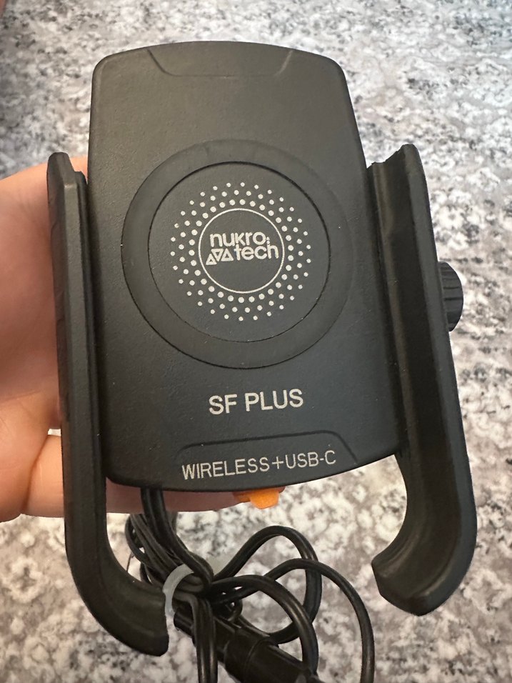 Nukrotech SF PLUS siyah telefon tutucu, kablosuz şarj ve USB-C bağlantısını destekler. Ayarlanabilir kollarla telefonunuzu güvenle tutar.