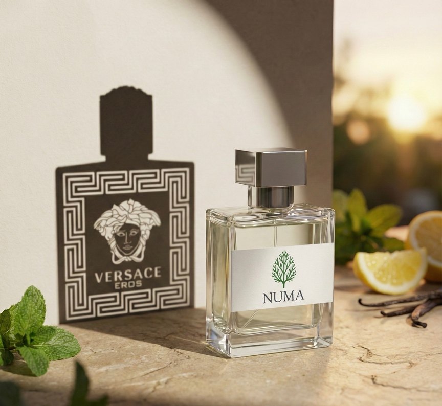 NUMA markasınının Versace Eros muadili erkek parfümü, şeffaf dikdörtgen şişede, gümüş kapaklı, ferah ve zarif kokusuyla dikkat çekiyor.