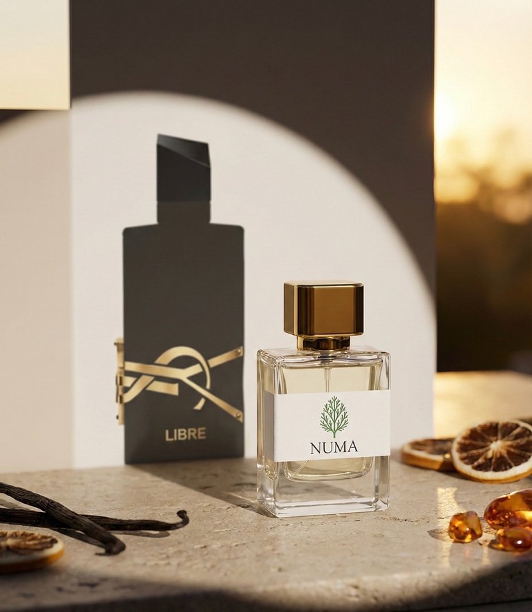 Numa Libre kadın parfümü, altın kapaklı şeffaf şişede ve doğal esintili etiketle sunulur. ✨