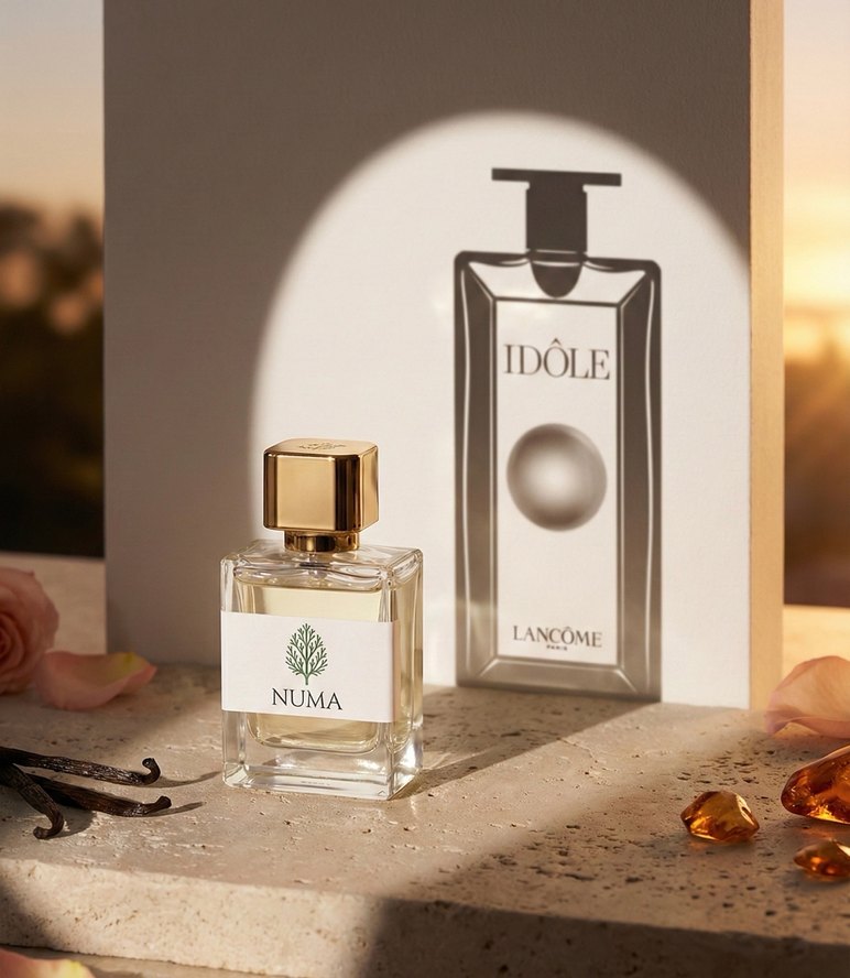 Numa kadın parfümü, şeffaf cam şişe ve altın kapakla, Lancome Idôle gölgesi önünde yer alıyor. Zarafet ve şıklık vaat ediyor.