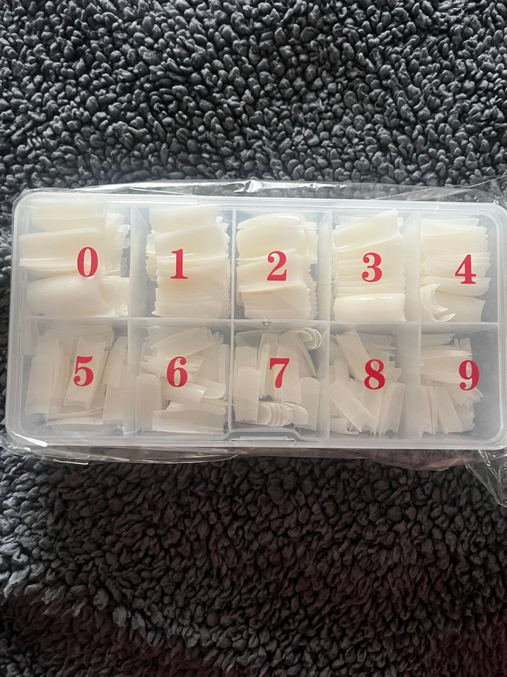 0'dan 9'a numaralandırılmış beyaz tırnak süsleri, seçimi kolaylaştıran şeffaf bölmeli kutuda saklanır.