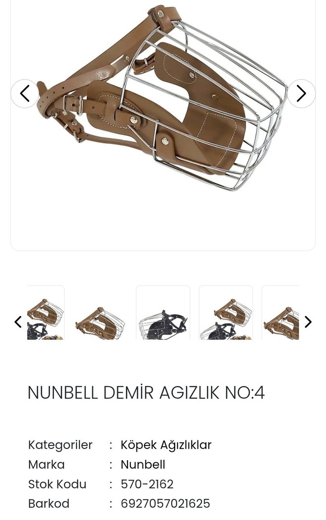Nunbell markalı, demir kafes yapısına sahip No:4 köpek ağızlığı, konforlu ve sağlam camel renkli deri kayışlarla donatılmıştır.