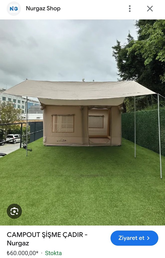 Nurgaz Campaut Şişme Çadır.39.000 TL⛺ Bütün Aksesuarları mevcut ⛺ Defarmasyon Yok ⛺Teknik Özellikler ✔ Malzeme: Su geçirmez antibakteriyel pamuk kanvas ✔ Kurulum: Şişme gövde – destek direksiz ✔ Baca Çıkışı: Fermuarlı baca penceresi ✔ Ölçüler: 280 x 320 x 250 cm ✔ Ağırlık: 36 kg ✔ Kullanım Alanı: Şişme çadır, doğa yürüyüşleri, kamp alanları, festival alanları ✔ Kategori: 4 mevsim kamp çadırı