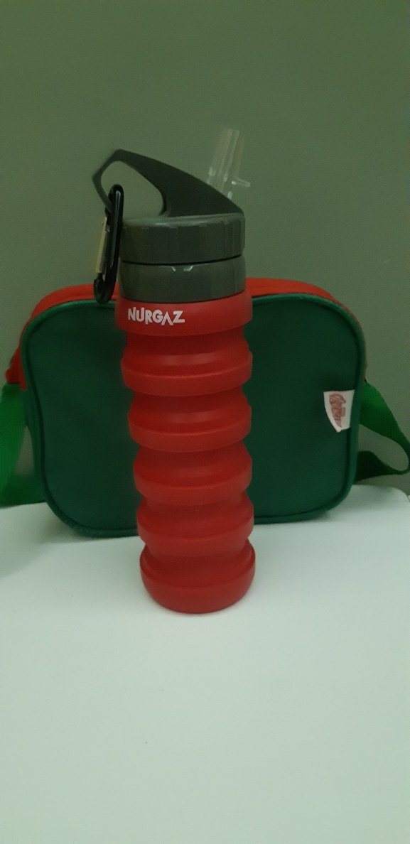 Nurgaz katlanabilir kırmızı termos matara, esnek tasarımı ve taşıma klipsiyle çocuklar için uygun.