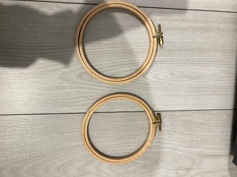 İki adet parlak bej renkte, ayarlanabilir metal vidalı nakış kasnağı seti.