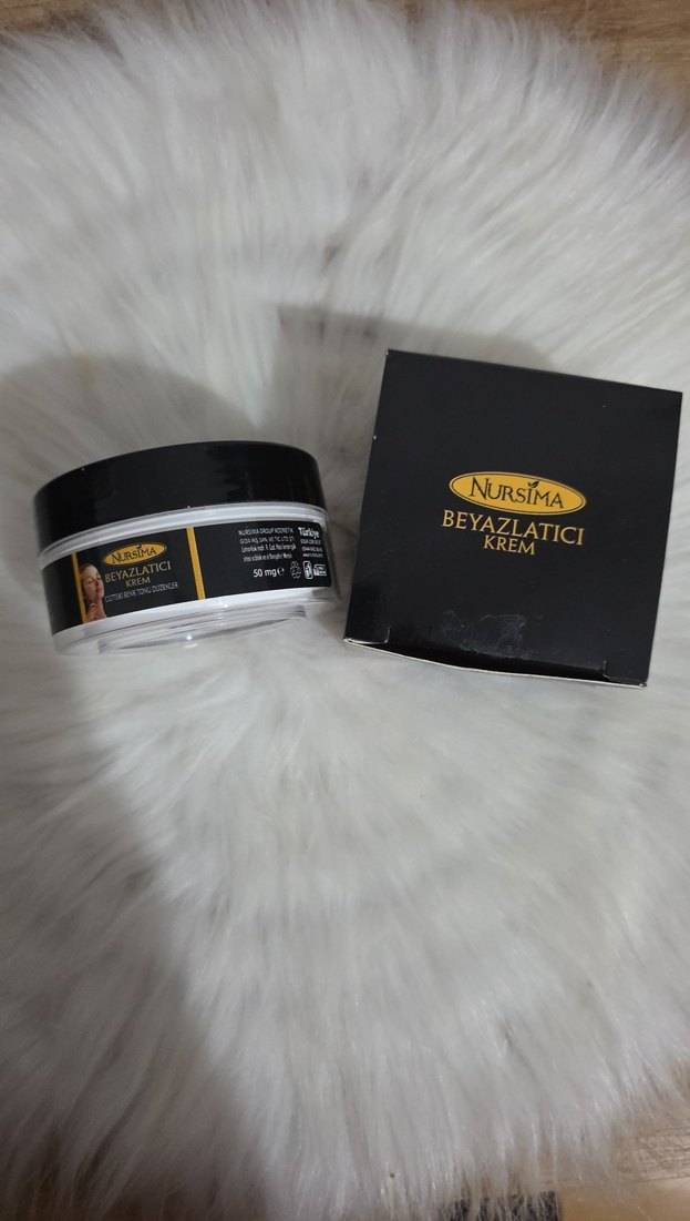 Nursima markalı 50 ml beyazlatıcı krem, cildi nemlendirir ve aydınlatır. Siyah ve altın renkli kutu ve kavanozda sunulmuştur.