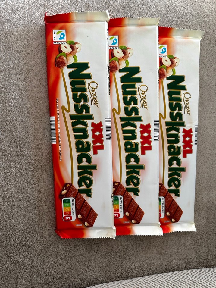 Üç adet XXL boyutta Nussknacker sütlü çikolata barı, fındıklı. Kremamsı dokusu ve zengin fındık aromasıyla öne çıkar. Tanesi 300 gram
