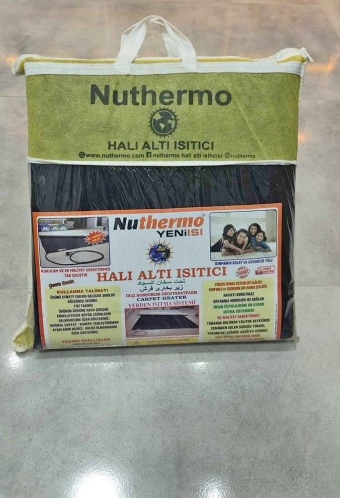Nuthermo halı altı ısıtıcı, gri ve camel renklerde desenli, kolay kurulum ve etkili ısı dağılımı sağlar. İç mekanlarda sıcaklık sunar. ️