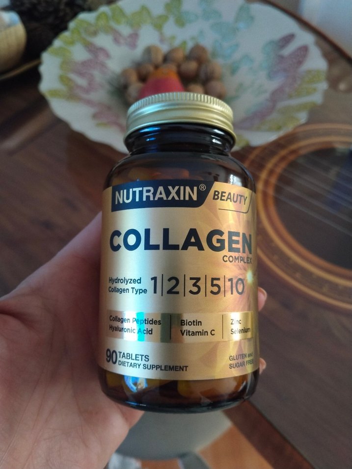 Nutraxin Beauty Kollajen Kompleksi, hidrolize kollajen peptitleri, biotin, C vitamini ve çinko içerir. 90 tabletlik takviye üründür. içinden 5 adet içtim