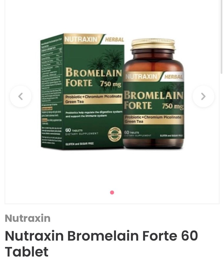 KULLANILDI TAHMİNİ 15 tane Nutraxin Bromelain Forte 750 mg, probiyotik, krom pikolinat ve yeşil çay içeren 60 tabletlik sindirim ve bağışıklık destek ürünü. Glutensiz ve şekersiz.