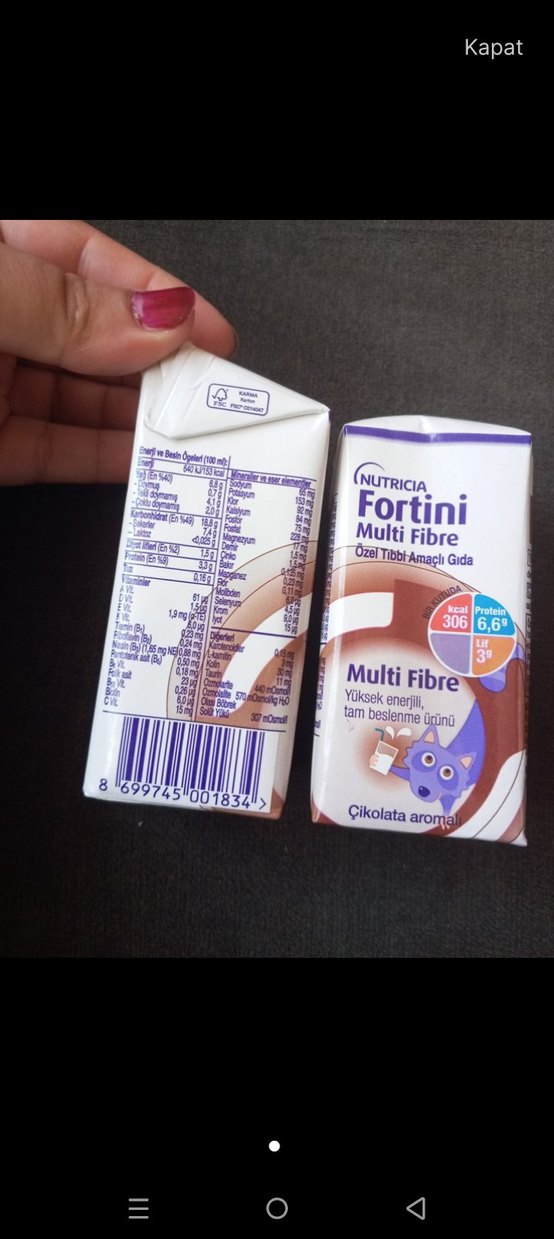 Nutricia Fortini Multi Fibre çikolata aromalı süt, 100 ml'de 306 kcal ve %6,6 protein ile yüksek enerjili tam beslenme sağlar.