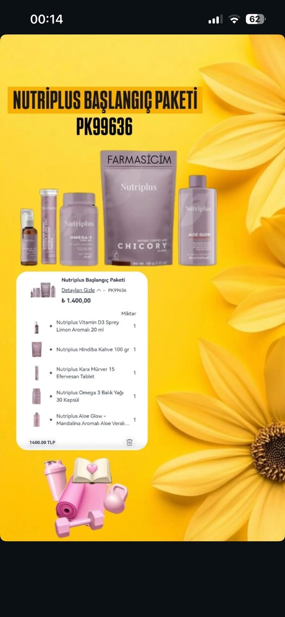 Nutriplus Başlangıç Paketi; Vitamin D3 sprey, Hindiba kahve, kara meyve efervesan tablet, Omega 3 balık yağı kapsülü ve mandalina aloe veralı Aloe Glow vücut losyonu içerir.