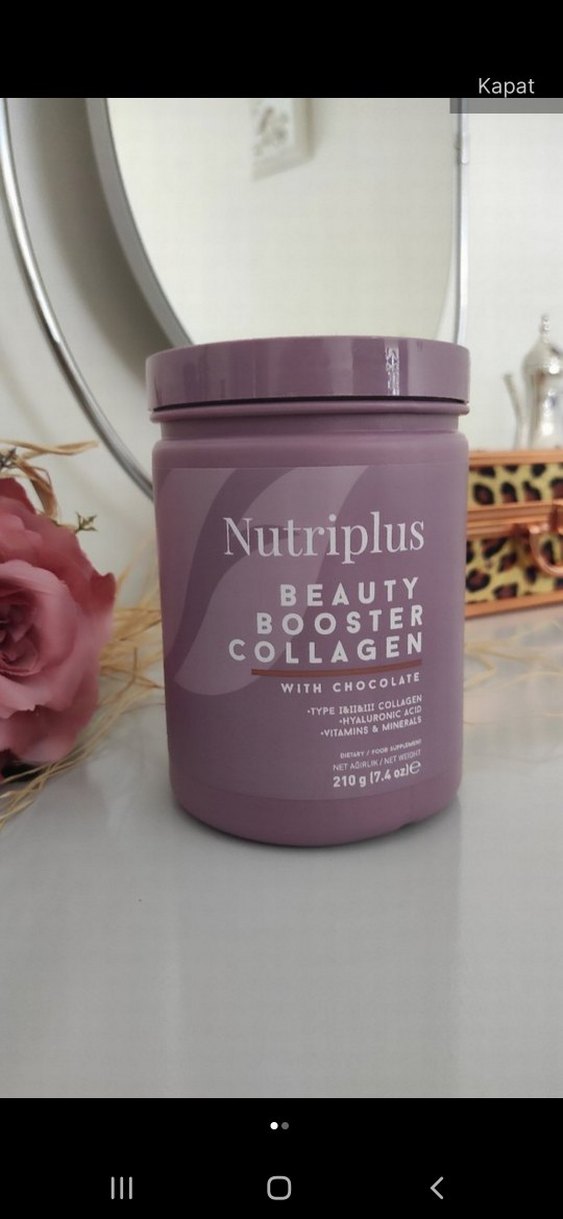 Nutriplus Beauty Booster Kollajen çikolatalı aromalı toz formda, tip I II III kollajeni, hyaluronik asit, vitamin ve mineraller içerir. 210 g net ağırlık.
