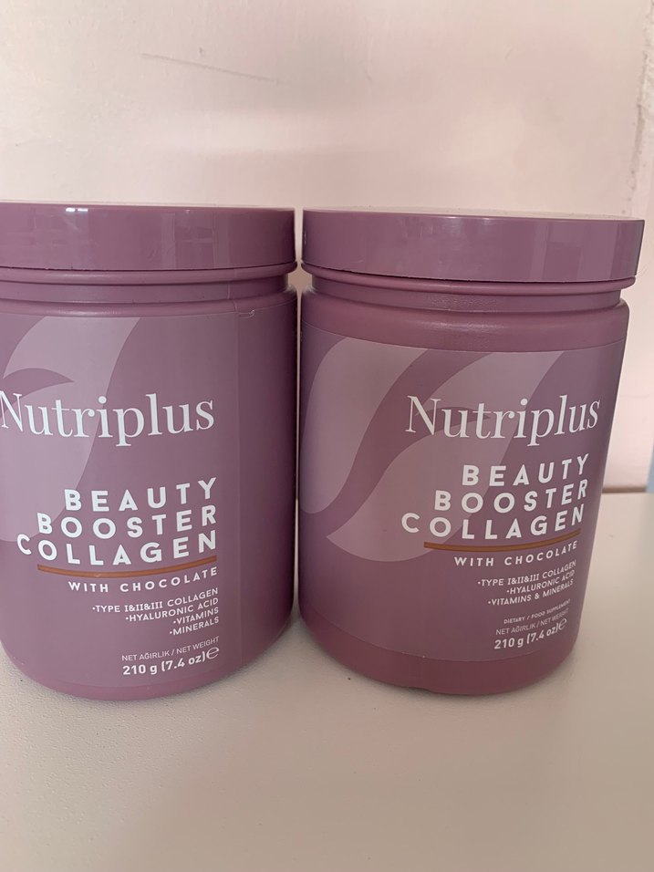 Nutriplus Beauty Booster Kollajen, çikolata aromalı koyu mor toz, tip I kollajen, hyalüronik asit, vitaminler ve mineraller içerir.