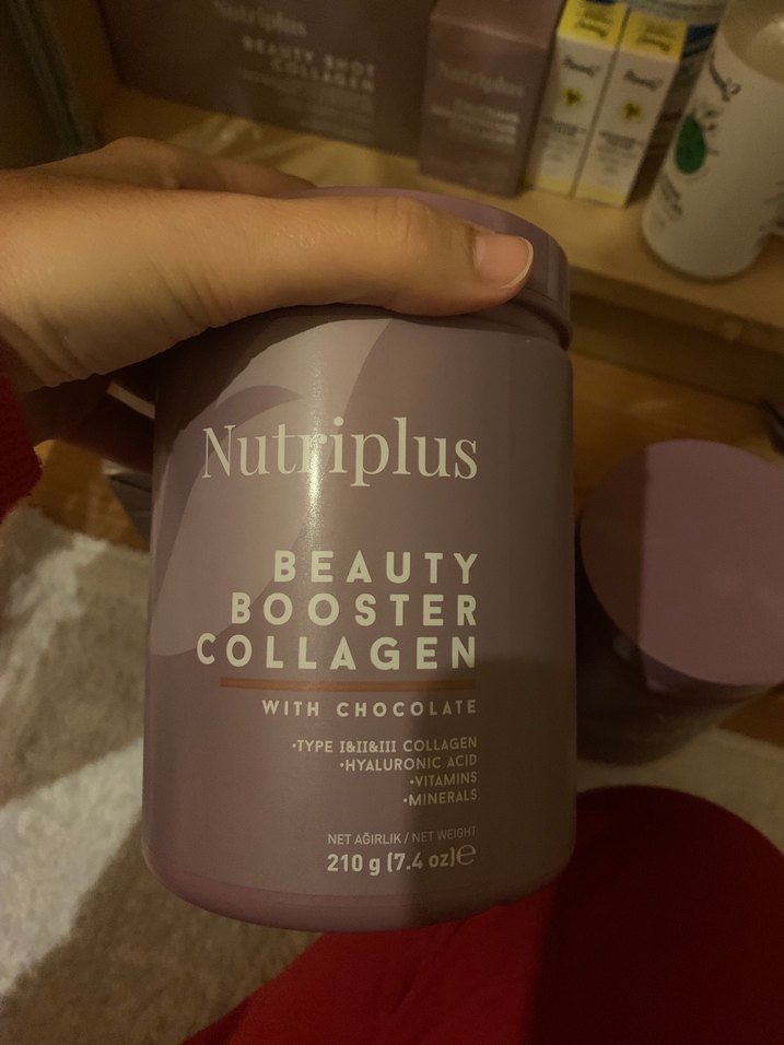 Nutriplus çikolatalı güzellik destekleyici kolajen tozu, tip I&III kolajen, hyaluronik asit, vitaminler ve mineraller içerir.