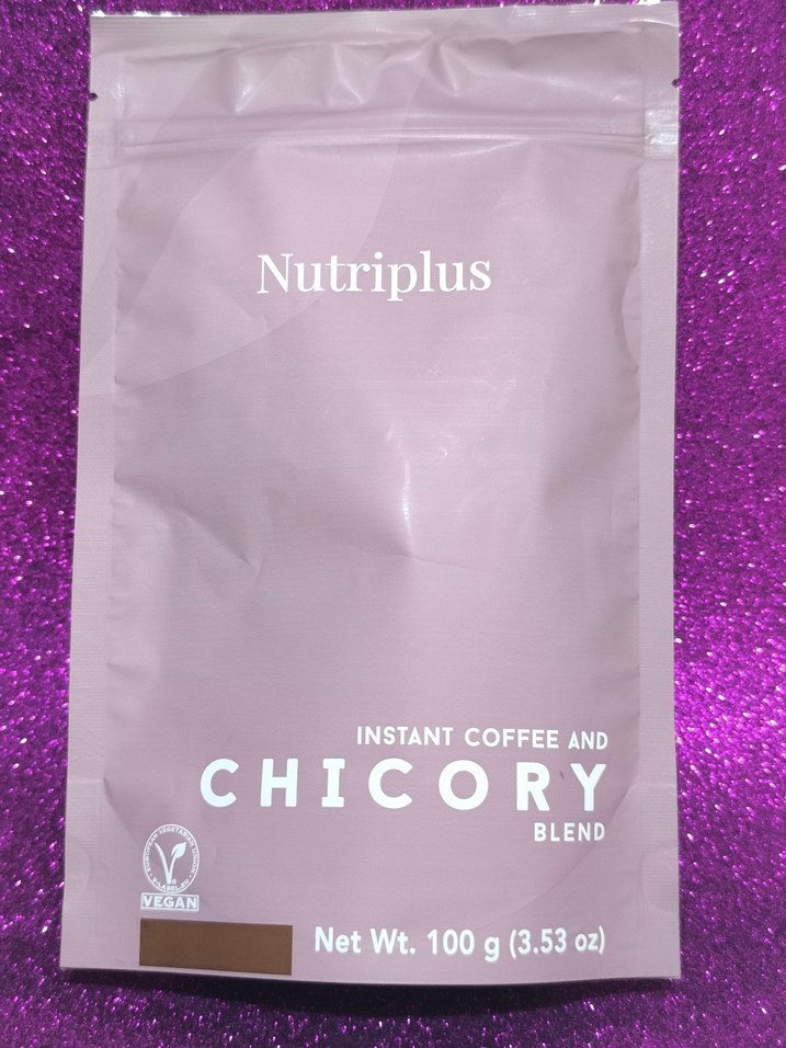 Nutriplus markasına ait, 100 gram ağırlığında, parlak bordo renkte instant kahve ve hindiba karışımı toz paketi. Vegan dostudur. ☕