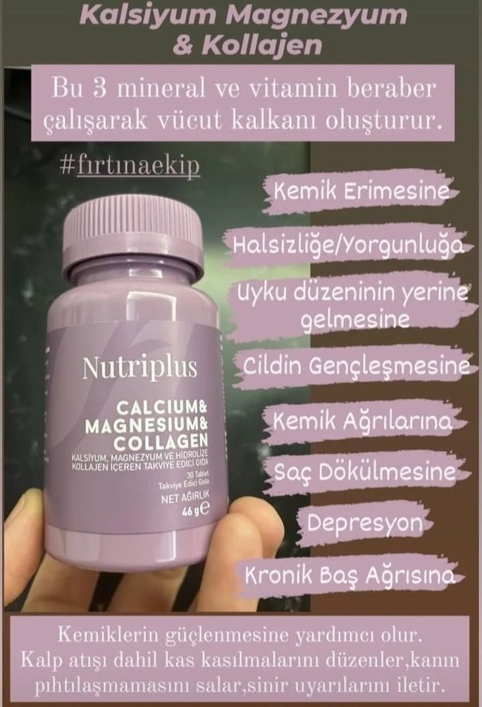 Nutriplus, kalsiyum, magnezyum ve kollajen içerir. Kemiklerin güçlenmesine, yorgunluğun azalmasına, uyku düzeninin iyileşmesine ve cildin gençleşmesine destek olur. Kas kramplarını, saç dökülmesini, depresyonu ve kronik baş ağrılarını hafifletir.