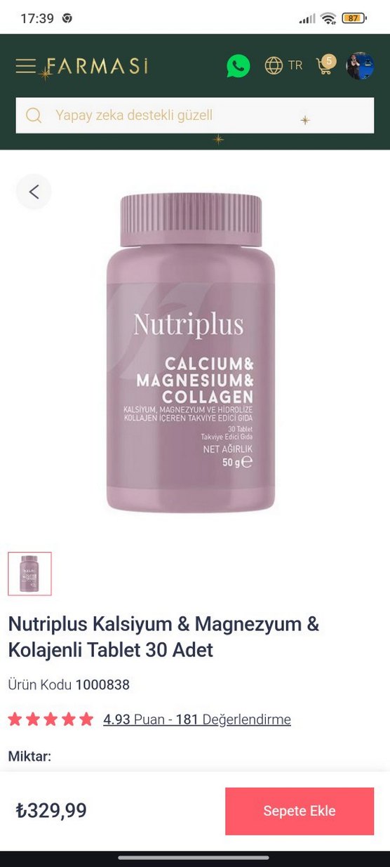 Nutriplus tabletler, kalsiyum, magnezyum ve kolajen içerir. 30 tablet ve 50 g net ağırlığındadır.