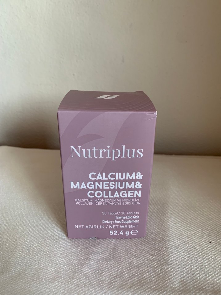 Nutriplus tablet formda kalsiyum, magnezyum ve kolajen içeren takviyedir. Net ağırlığı 52,4 g'dır ve genel sağlığı destekler.