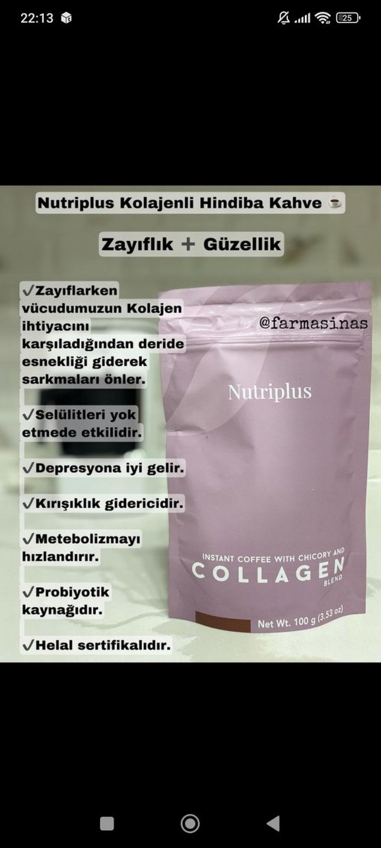 Nutriplus Kolajenli Hindiba Kahve, kolajen ihtiyacını karşılayarak cilt esnekliğini artırır, selülit ve kırışıklıkları azaltır, metabolizmayı hızlandırır, probiyotik kaynağıdır ve helal sertifikalıdır. ☕