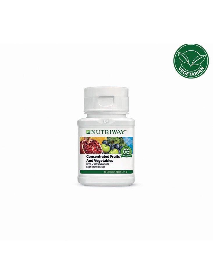 Nutriway konsantre meyve ve sebze tabletleri, doğal özler içeren ve vejetaryenler için uygun bir takviyedir.
