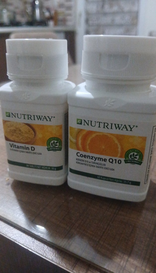 Nutriway markasına ait hafif turuncu renkte Vitamin D ve Coenzyme Q10 tozları. Vitamin D ve Koenzim Q10 içerir.