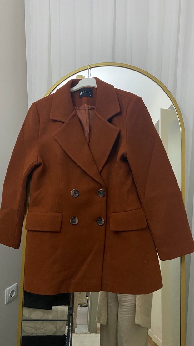 Kiremit süet kadın blazer ceket, düğmeli ve kesimli yaka detayına sahiptir. Uzun kollu, midi boy ve regular fit olan bu ceket, ofis ve sokak stili için uygundur. Desensiz, trend casual tarzda. Son fotoğraftaki nuuwears sayfasından almıştım hiç giymedim ihtiyaç fazlası olduğu için satıyorum