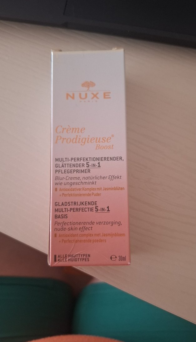 NUXE Crème Prodigieuse Boost, 5'li çok amaçlı nemlendirici ve baz kremdir. Yasemin çiçeği ve pürüzsüzleştirici tozlar içerir, cilde doğal ve kusursuz bir görünüm verir. Tüm cilt tipleri için uygundur.