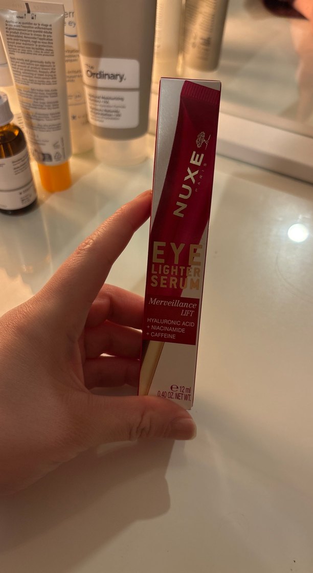 Nuxe göz altı aydınlatıcı serum, hyaluronik asit, niasinamid ve kafein içerir. 12 ml serum göz çevresini aydınlatır ve canlandırır. ✨ Ne ise yaradigini bilmiyorum sadece acip elime surdum yapisina bakmak icin. Bilen kisi alir herhalde