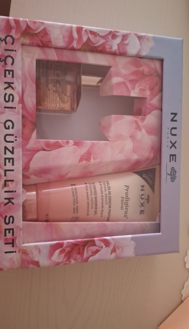 Nuxe pastel pembe renkli, çiçek desenli ambalajda tonlu duş jeli ve allık içeren güzellik seti.