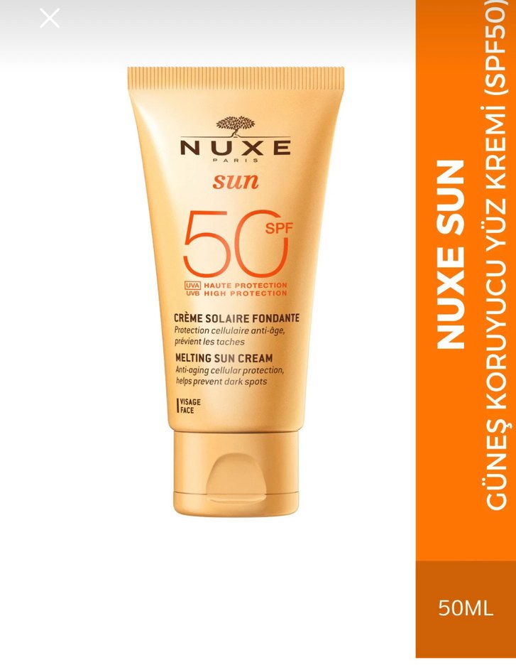 Nuxe Sun Yüz İçin SPF 50 Güneş Kremi, yüksek koruma sağlar, yaşlanma karşıtı özelliklere sahiptir ve koyu lekelerin oluşumunu engeller.