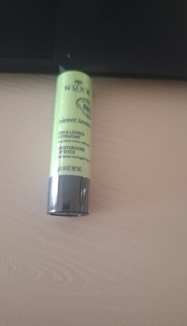 NUXE markasına ait, parlak yeşil renkte, tatlı limon özlü nemlendirici dudak balmı stick formunda.