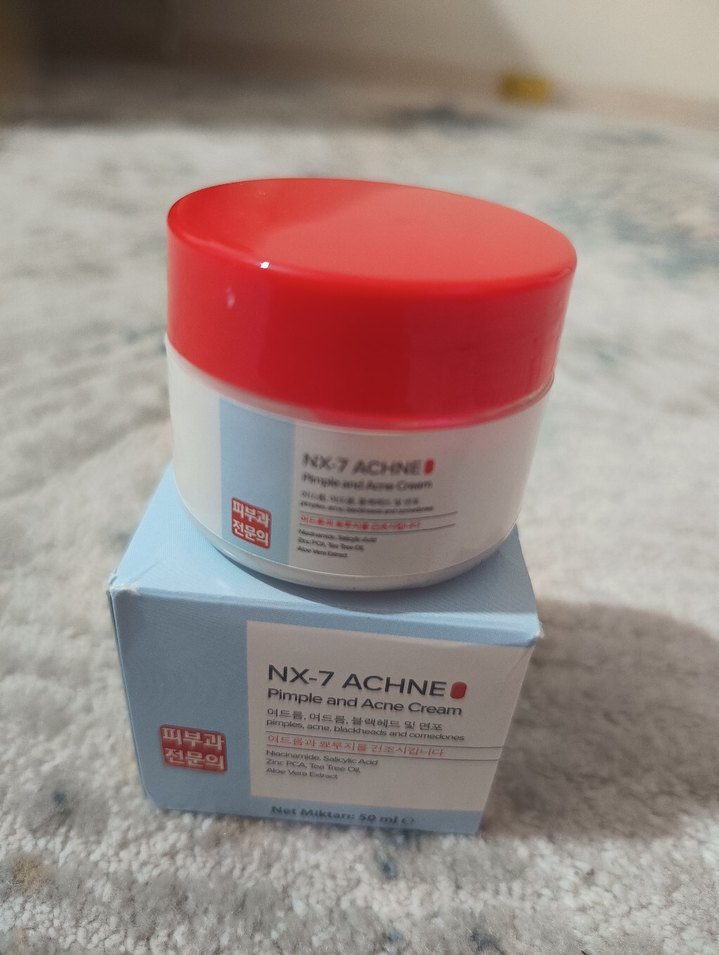 NX-7ACHNE Sivilce ve Akne Kremi, cildi yatıştırır ve akne problemini hedefler. 50 ml, kırmızı kapaklı kutuda.
