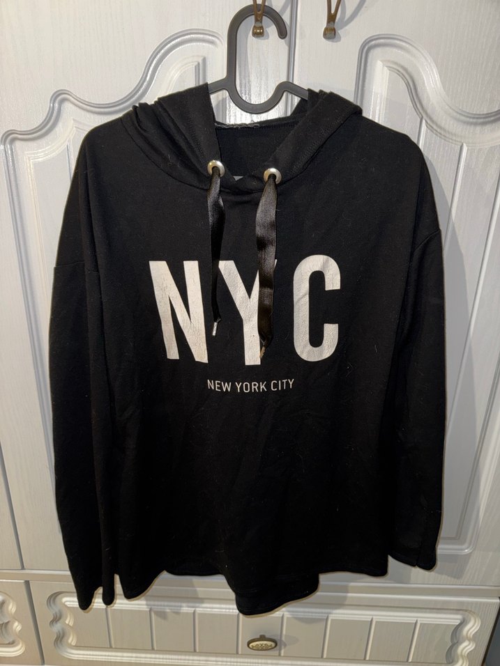 Siyah, uzun kollu, yuvarlak yaka ve bol kesim kadın sweatshirtü. NYC baskılı, şapkalı. Lcw Casual XL beden