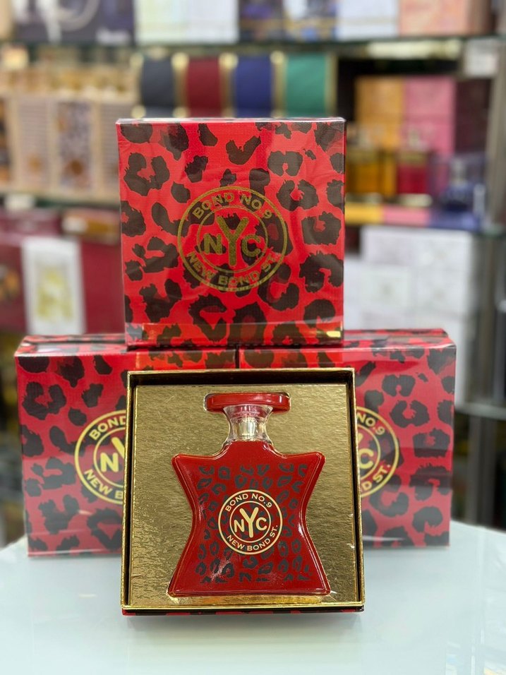 NYC Bond No. 9 kadın parfümü, 100 ml şişede, kırmızı ve leopar desenli şık tasarıma sahiptir. Altın detaylı zarif ambalajıyla öne çıkar.